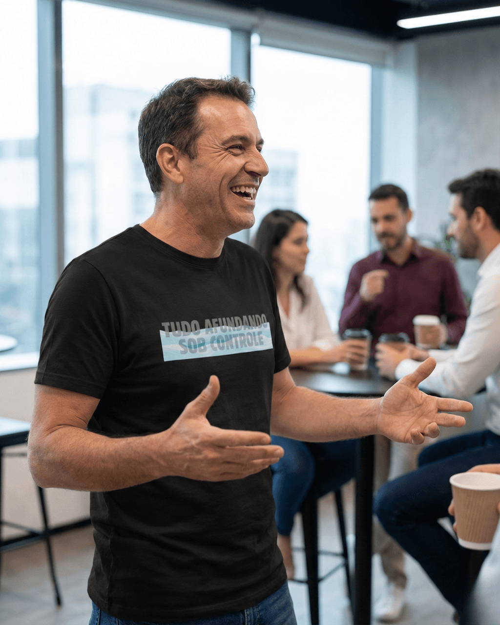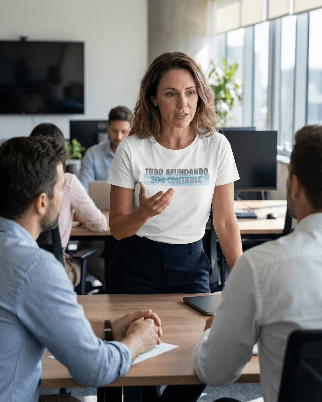 Sabe aqueles dias em que o prazo estourou, o sistema caiu e o telefone não para de tocar, mas você precisa manter a pose? A camiseta “Tudo afundando sob controle” é o uniforme oficial do profissional moderno que enfrenta crises com um sorriso no rosto (e talvez um leve desespero interno).